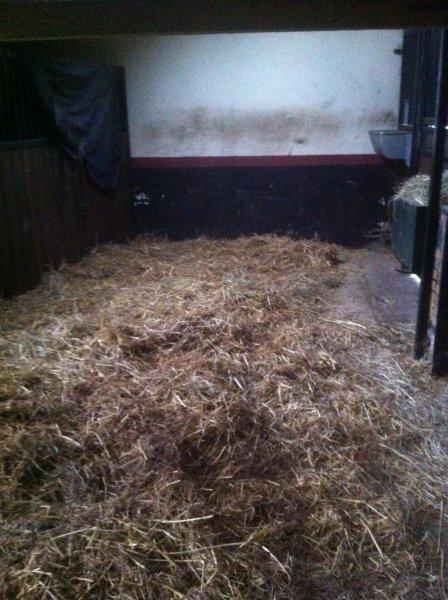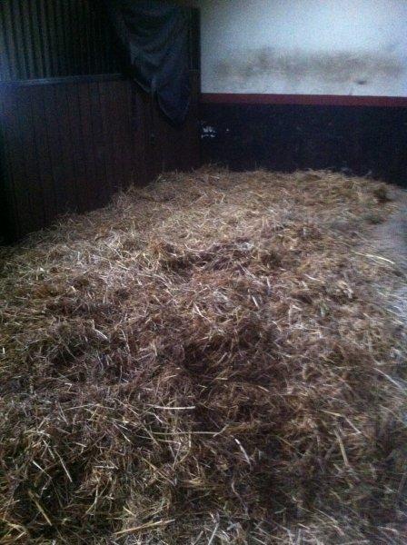Na 14 dagen ben ik op zoek gegaan naar de natte plekken in stal. De afgelopen 14 dagen heb ik netjes iedere dag de mestballen eruit gehaald met de mestboy. Dat gaat goed, het is veel minder zwaar dan iedere dag volledig uitmesten. Per dag haal ik er zo’n 3 a 4 mesthopen uit en verdeel ik het stro weer egaal met een riek. Dat wil zeggen, ik schuif het een beetje naar de plekken waar het dunner bezaaid is. Je mag het bed niet omkeren, dus niet echt scheppen met de riek. Nadat ik de natte plekken heb weggehaald ziet het er zo uit.